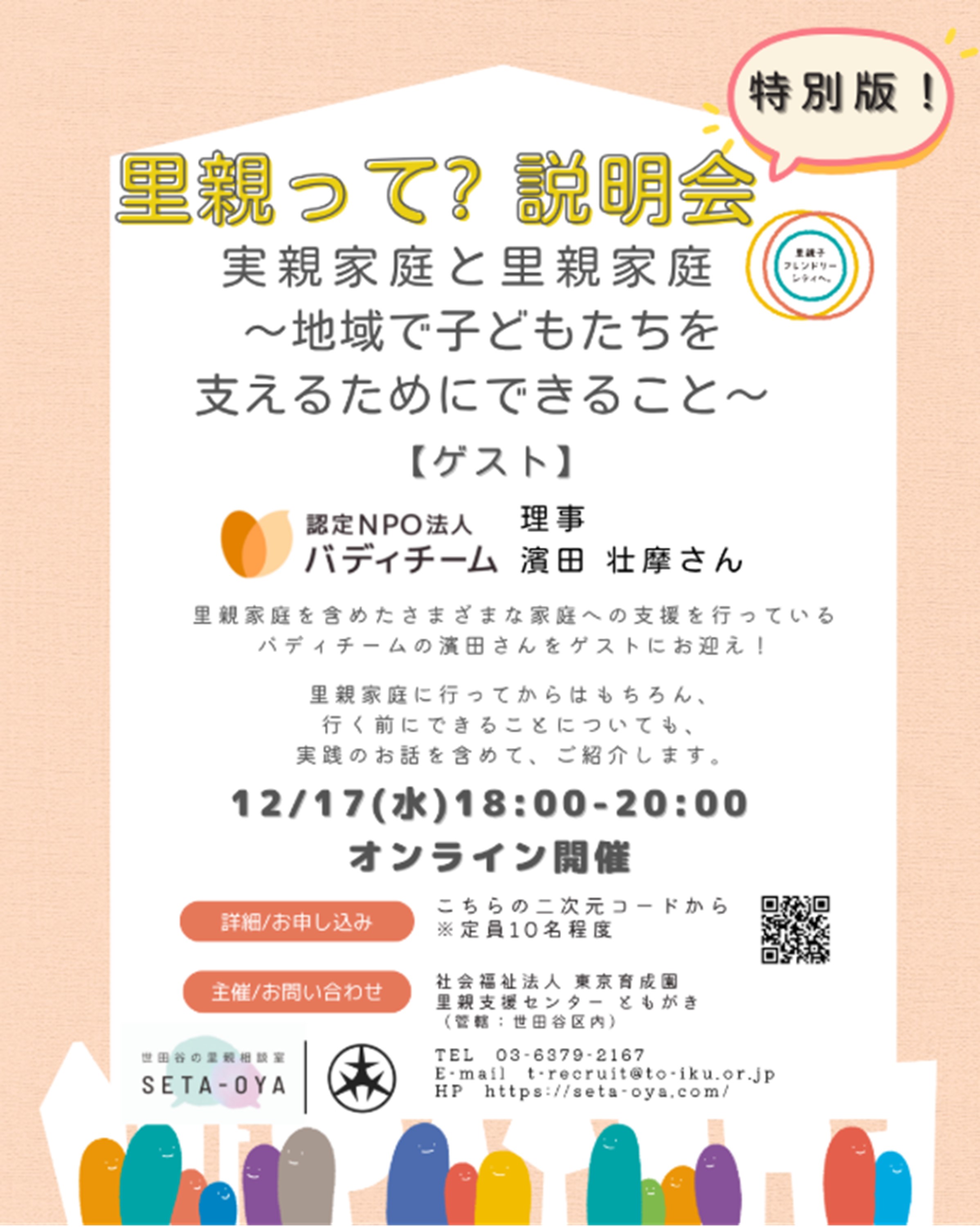 | 問い合わせ先 | 社会福祉法人東京育成園 里親支援センターともがき t-recruit@to-iku.or.jp 03-6379-2167 |