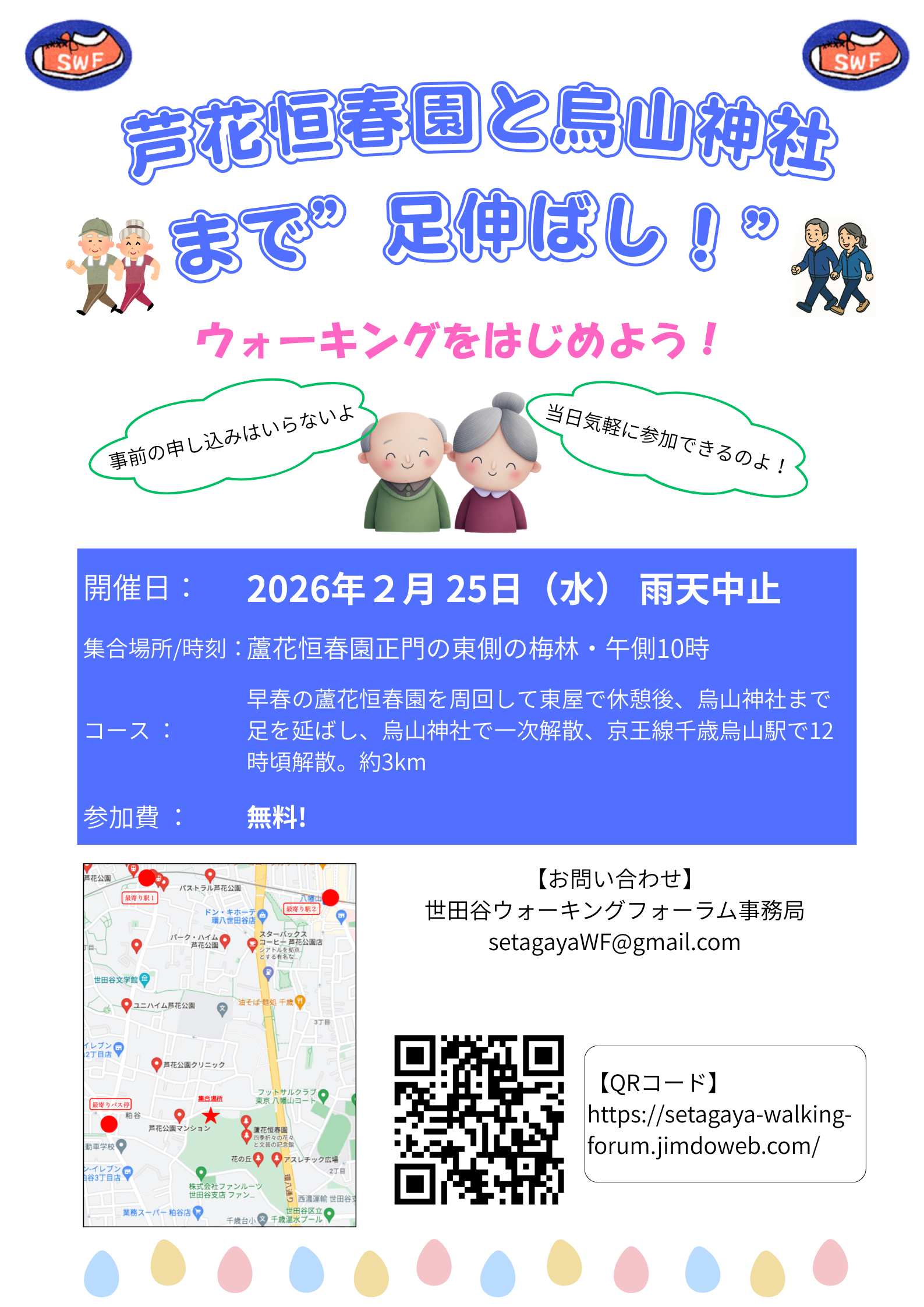 | 問い合わせ先 | 世田谷ウォーキングフォーラム事務局までメールでお願いします。 Mail: setagayaWF@gmail.com |