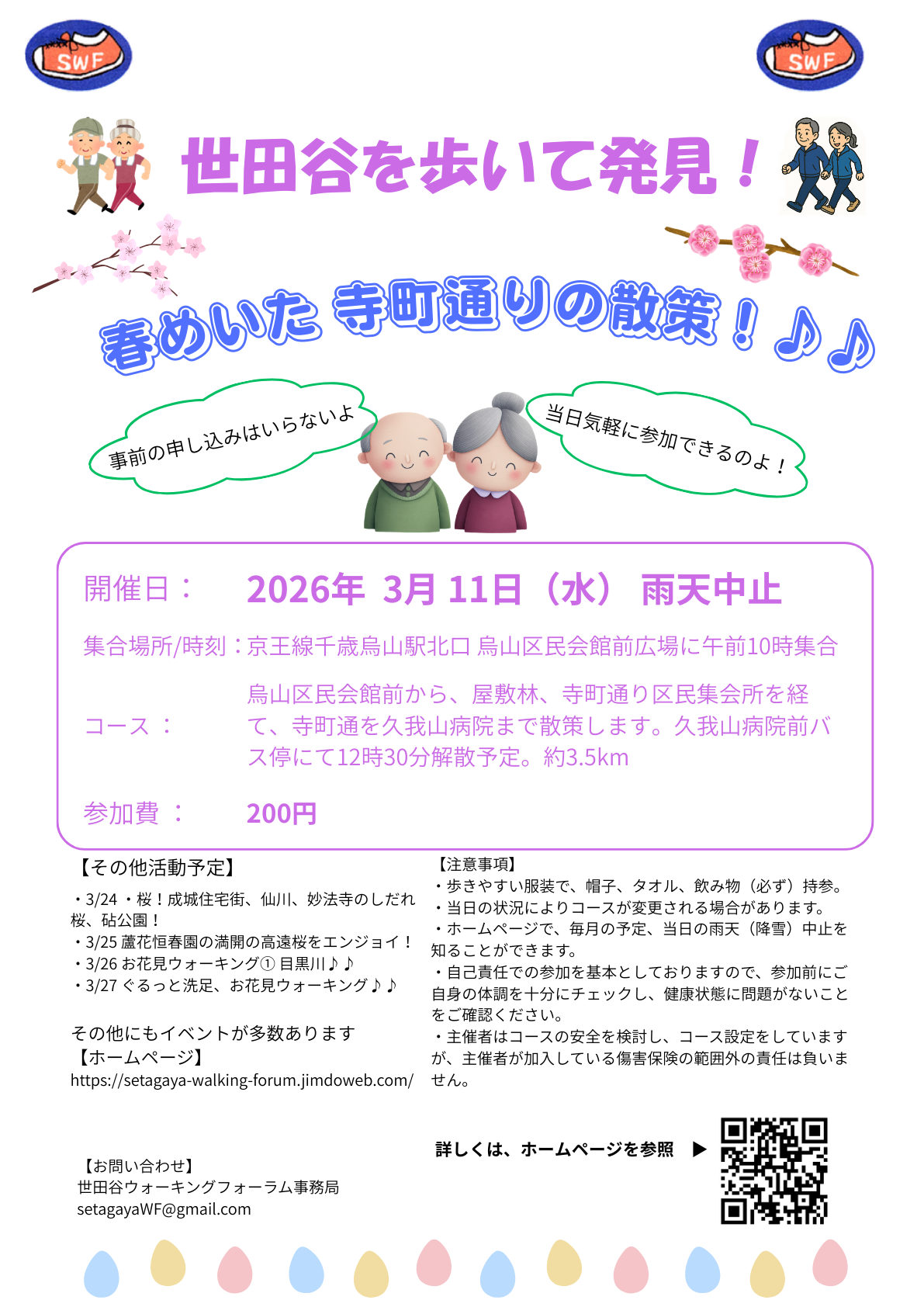 | 問い合わせ先 | 世田谷ウォーキングフォーラム事務局までメールでお願いします。 Mail: setagayaWF@gmail.com |