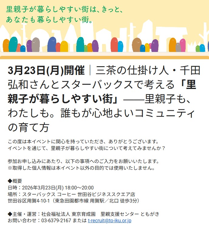 | 問い合わせ先 | 社会福祉法人東京育成園 里親支援センターともがき 03-6379-2167 tomogaki@to-iku.or.jp |