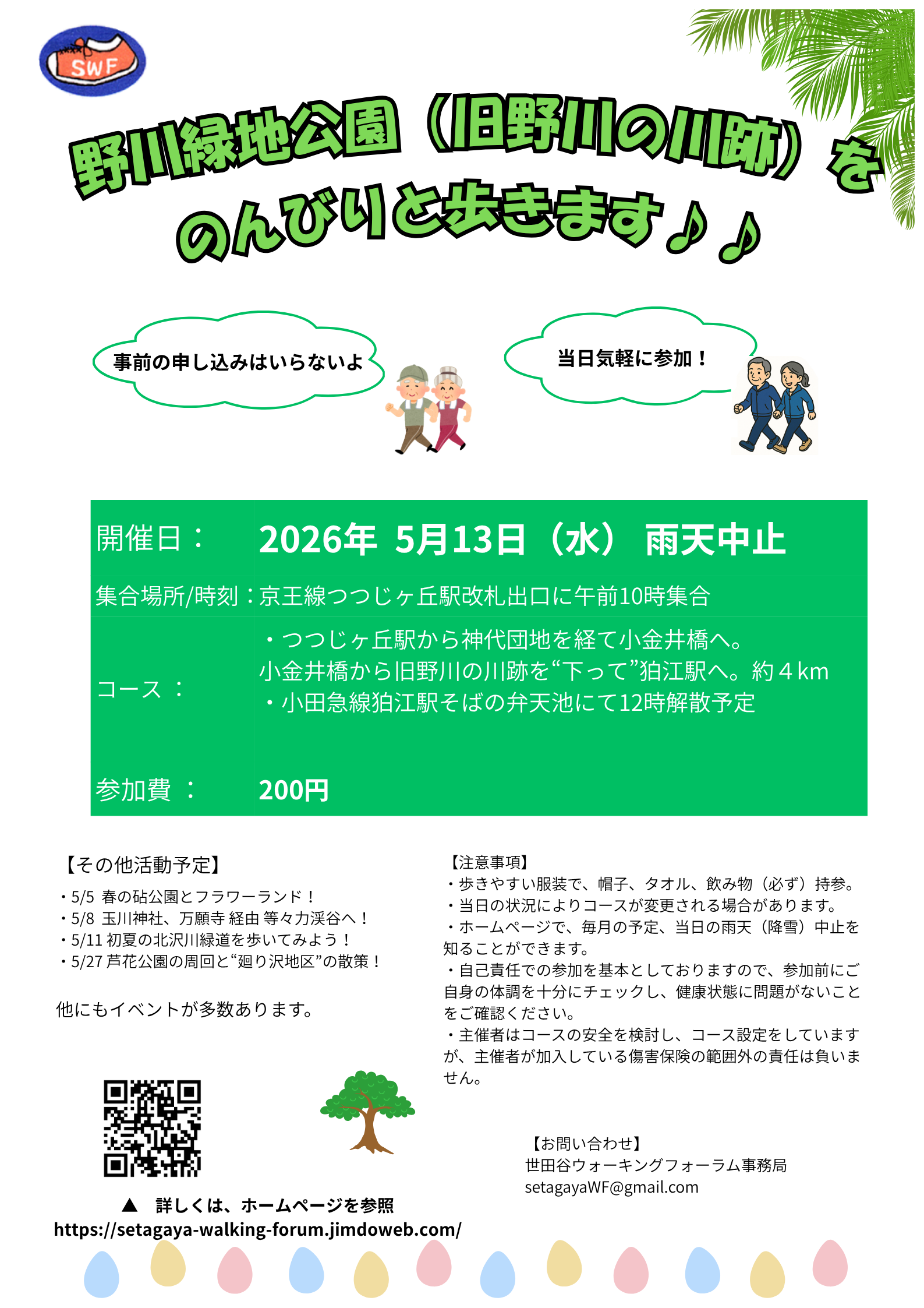 | 問い合わせ先 | 世田谷ウォーキングフォーラム事務局までメールでお願いします。 Mail: setagayaWF@gmail.com |