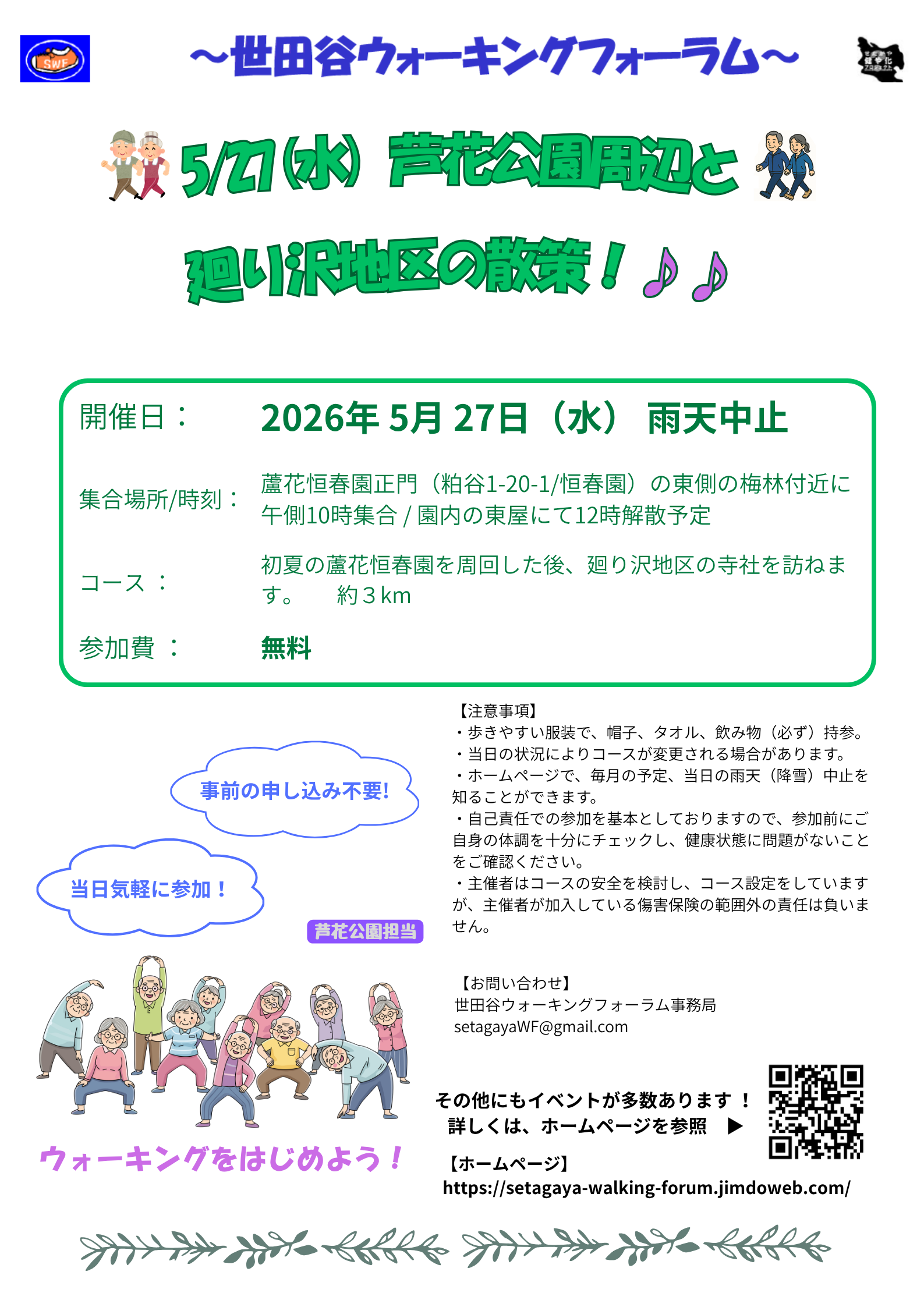 | 問い合わせ先 | 世田谷ウォーキングフォーラム事務局までメールでお願いします。 Mail: setagayaWF@gmail.com |