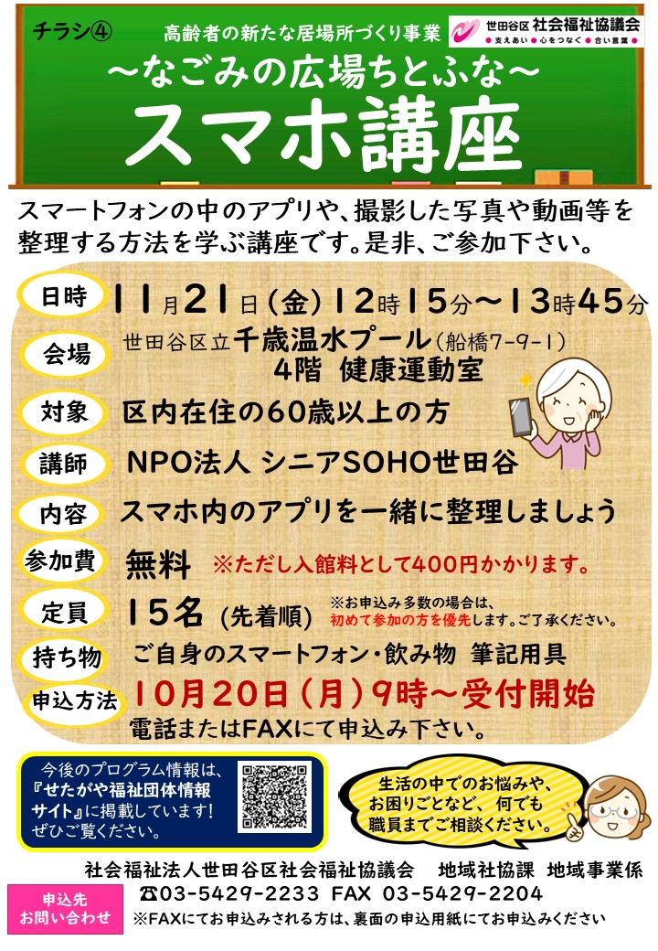 高齢者の新たな居場所づくり事業(なごみの広場ちとふな)スマホ講座4階(スマホの中の大掃除)11/21