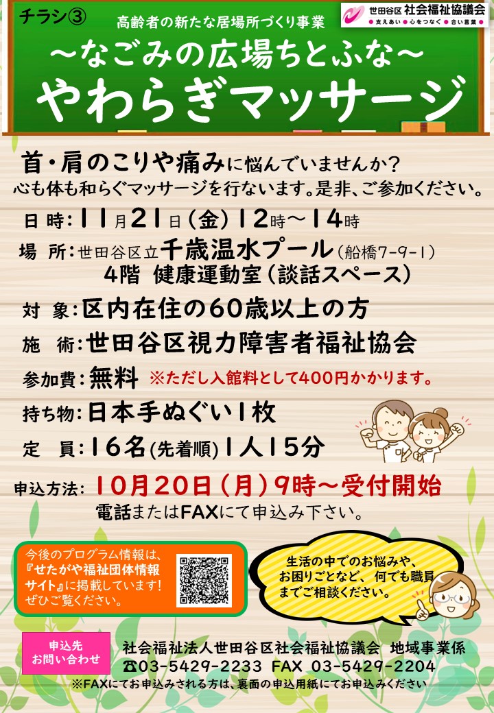高齢者の新たな居場所づくり事業(なごみの広場ちとふな)やわらぎマッサージB1(10/7)