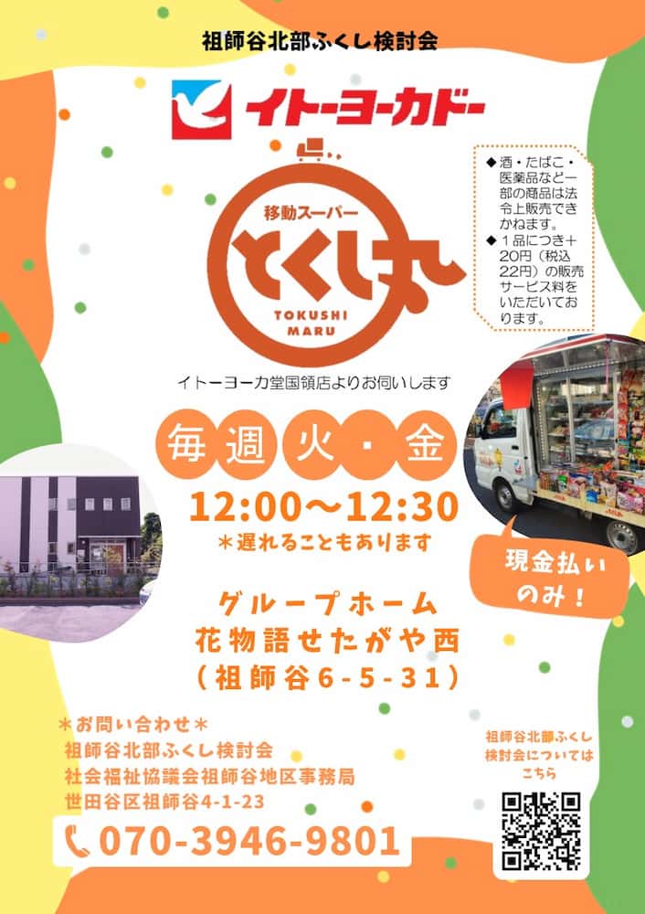 | 概要文 | 祖師谷北部ふくし検討会では、身近に商店の無い祖師谷北部エリアの方々の買い物支援について検討してきました。このたび「グループホーム花物語せたがや西」様のご協力もあり、イトーヨーカドーとくし丸の移動スーパーの販売を行うこととなりました! 食材や日用品の買い物はもちろん、買い物をとおして、住民同士の交流や集いの場にもなるように考えています。 |