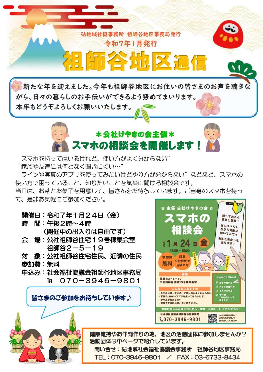 世田谷区社会福祉協議会 祖師谷地区事務局では、祖師谷地区通信を発行して、地区内で活動している”サロン・ミニデイ・高齢者クラブ・自主グループ”などの情報を紹介しています。