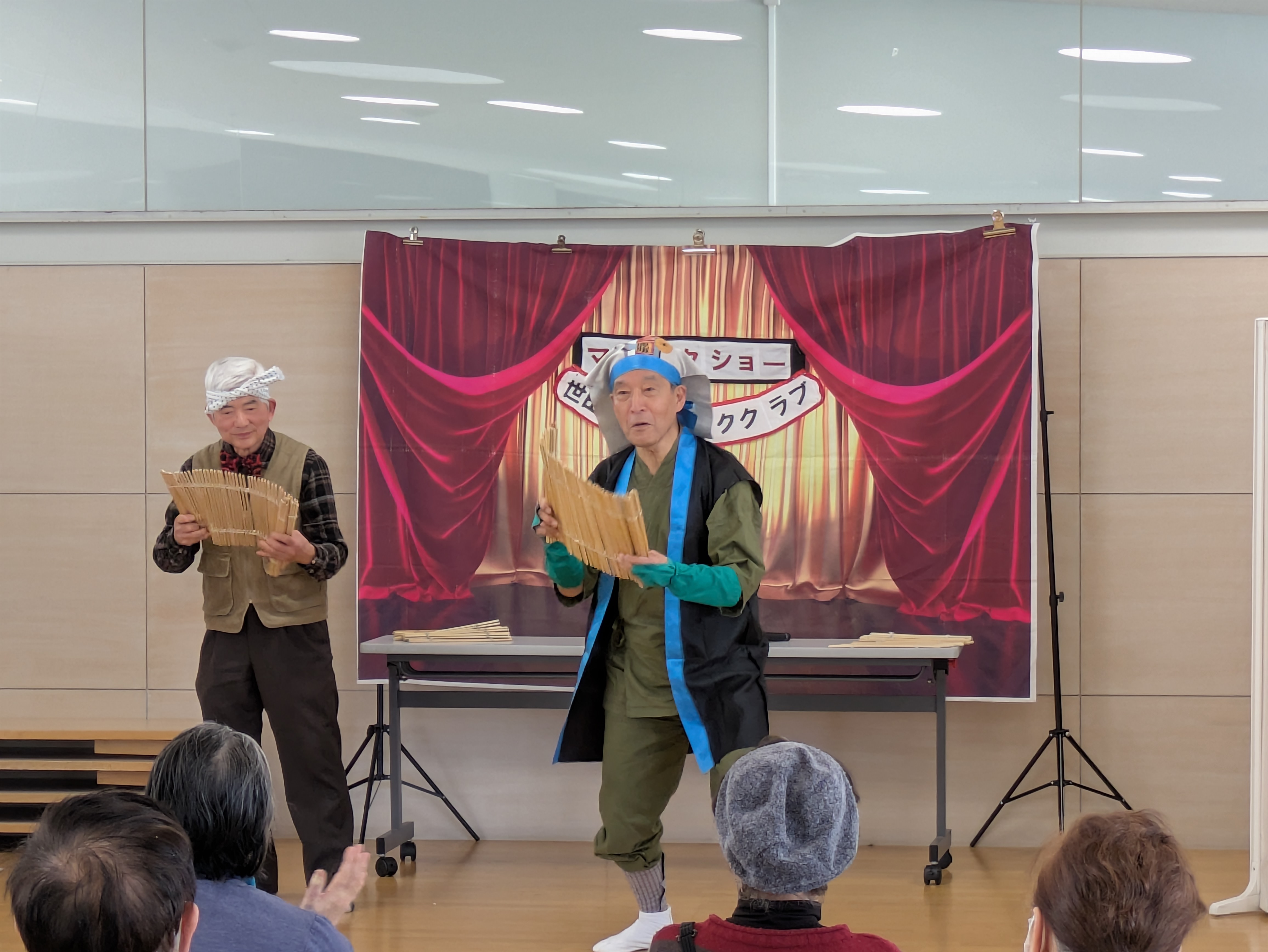 | 概要文 | 高齢者の新たな居場所づくり事業(なごみの広場ちとふな) 2月18日(火)は、初めての企画として世田谷マジッククラブによる「マジックdeショー」を開催しました。 世田谷マジッククラブは、区内で特技ボランティアとして活動している皆さんです。 リングやトランプ・カード、ロープ、スカーフなどを使ったマジックや、「南京玉すだれ」も披露いただき、初めてのマジックショーを楽しむことができました。 参加した方からは、「よっ 待ってました!」などのお声をいただいたり「初めて、南京玉すだれを見ることができました。とても楽しかったです」などの感想をいただきました。 今後も皆さまが楽しめるさまざまなプログラムをご用意してお待ちしています。 プログラムを楽しみながら、地域活動への参加もできるくつろぎの空間へ、ぜひおこしください! |