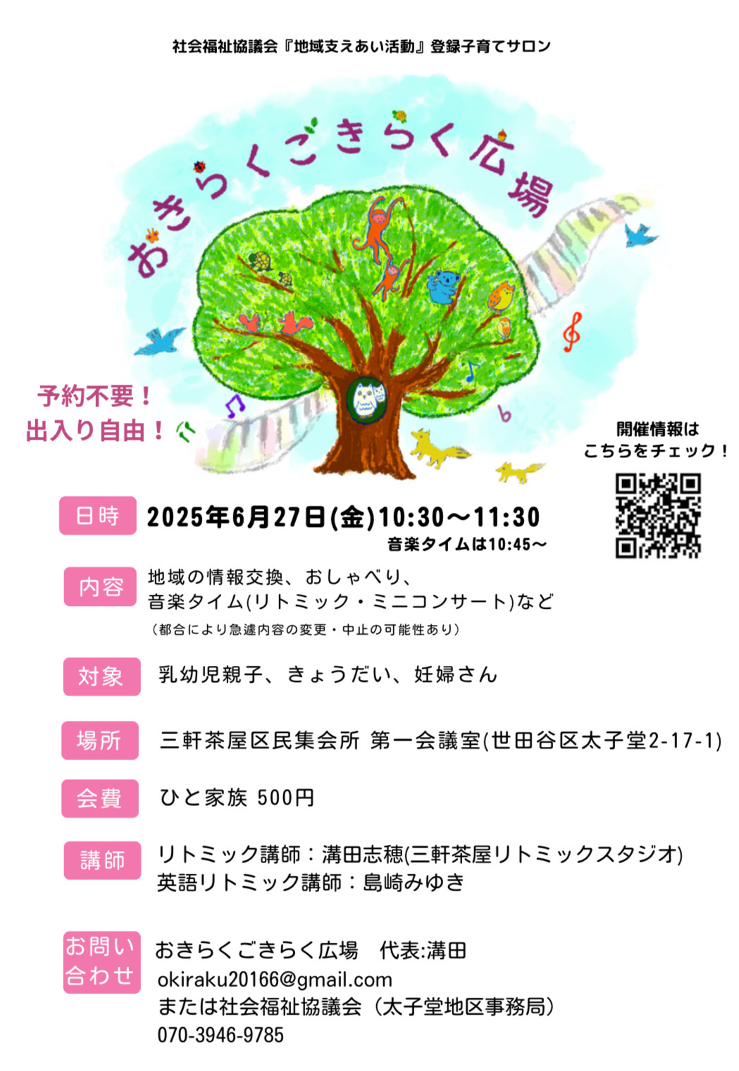 | 問い合わせ先 | おきらくごきらく広場 代表・溝田 okiraku20166@gmail.com 社会福祉協議会 太子堂地区事務局 TEL070-3946-9785 |