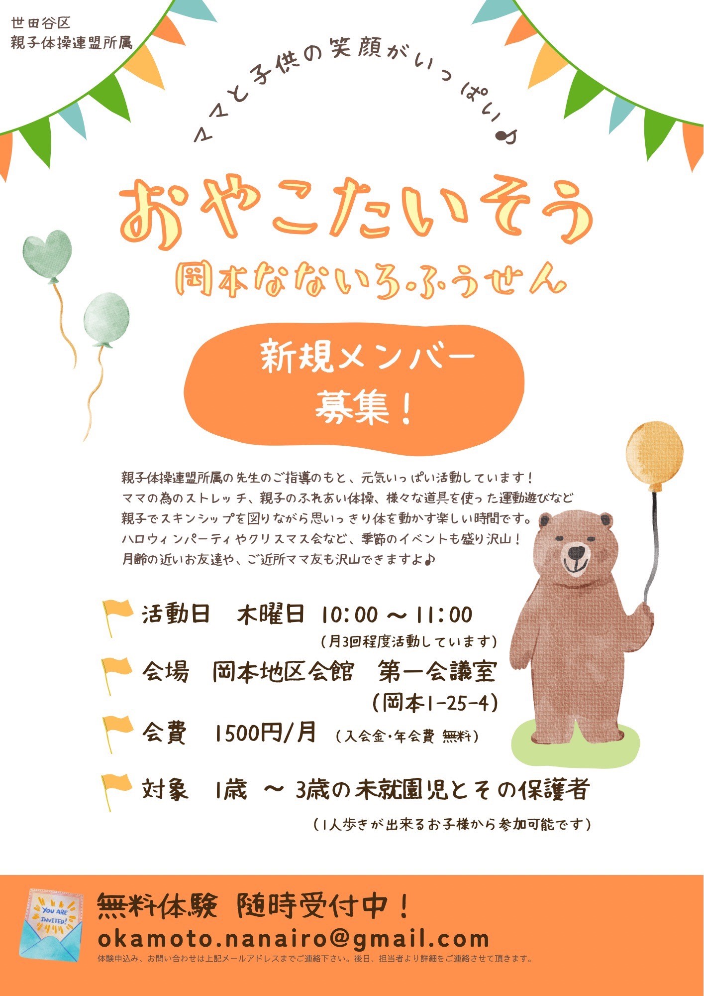 ♪親子体操「岡本なないろふうせん」無料体験会のお知らせ♪