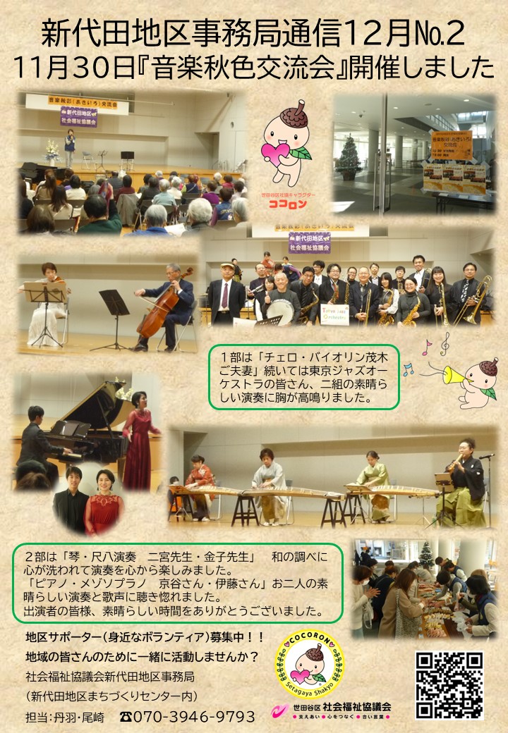 11月30日(日)に開催された新代田地区社会福祉協議会地域交流事業「音楽秋色交流会」当日のご様子を掲載しています。 出演者4組の素晴らしい演奏の数々を写真にて振り返っています。 是非、ご覧ください。
