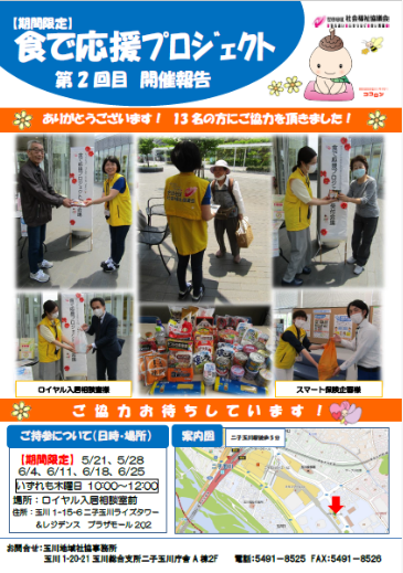 | 問い合わせ先 | 玉川地域社協事務所 住所:世田谷区玉川1-20-21 玉川総合支所二子玉川庁舎A棟2F 電話:03-5491-8525 |